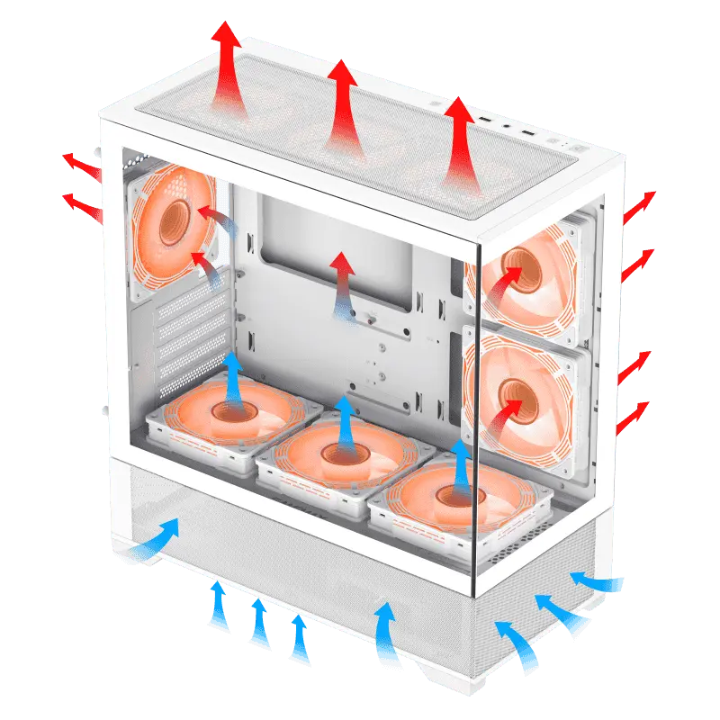 •To ensure adequate airflow, a Total 9x120mm fan position, Fine mesh panel at the top, and on the PSU shroud side, help with great ventilation.