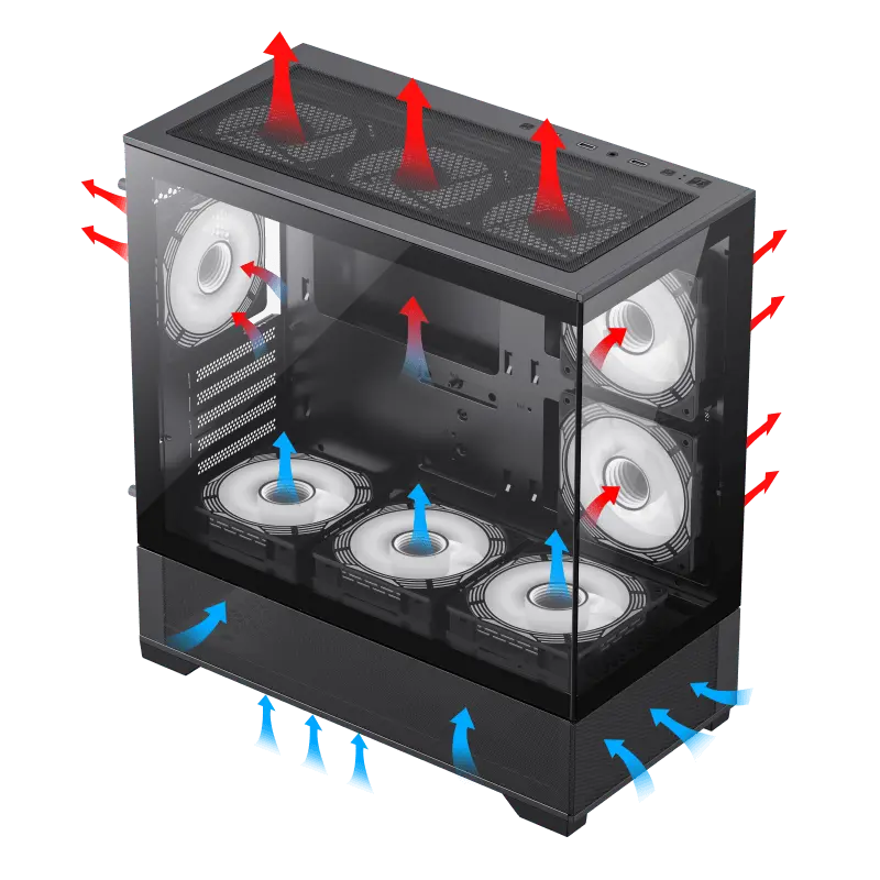 •To ensure adequate airflow, a Total 9x120mm fan position, Fine mesh panel at the top, and on the PSU shroud side, help with great ventilation.